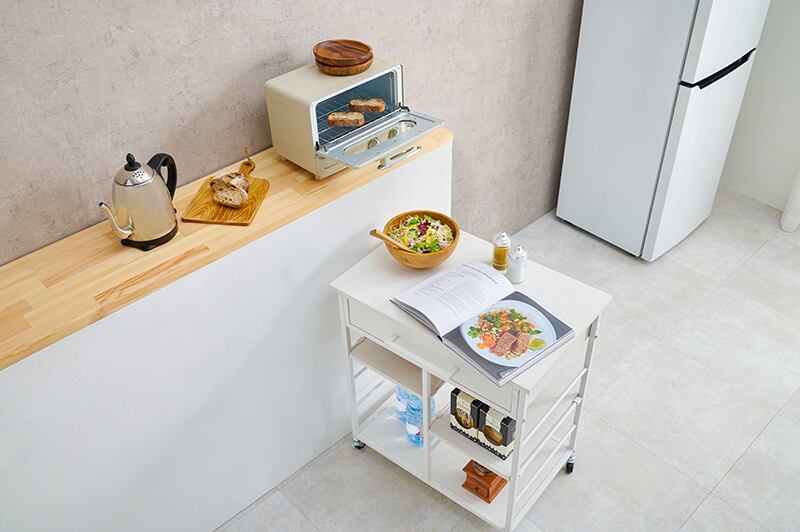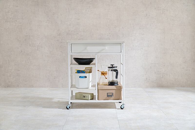 ユニークなデザインと機能性を兼ね備えたこのキッチンワゴンは、キッチンやダイニングでの作業を快適にサポートします。