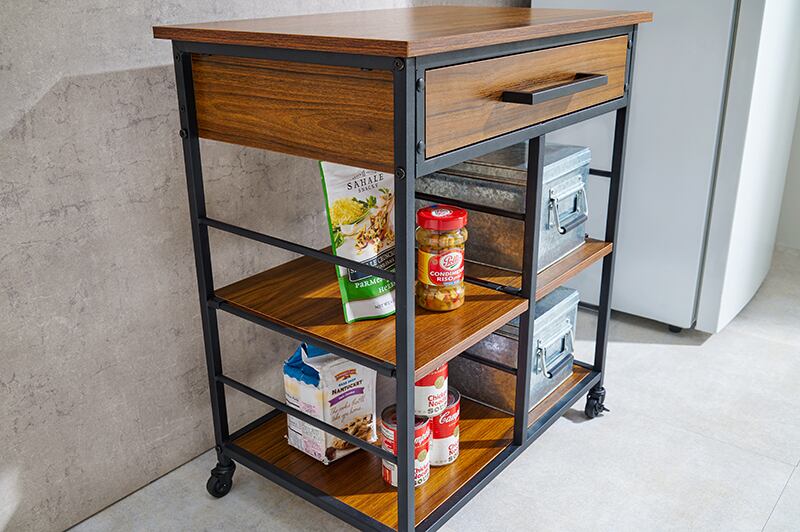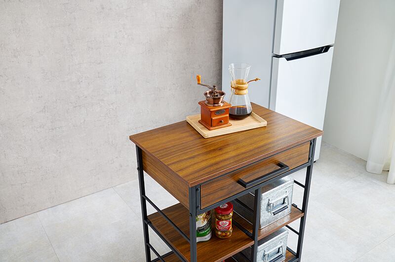 使い勝手抜群の収納力! オープンシェルフと引き出しを備えており、キッチン用品や食材を効率よく整理できます。