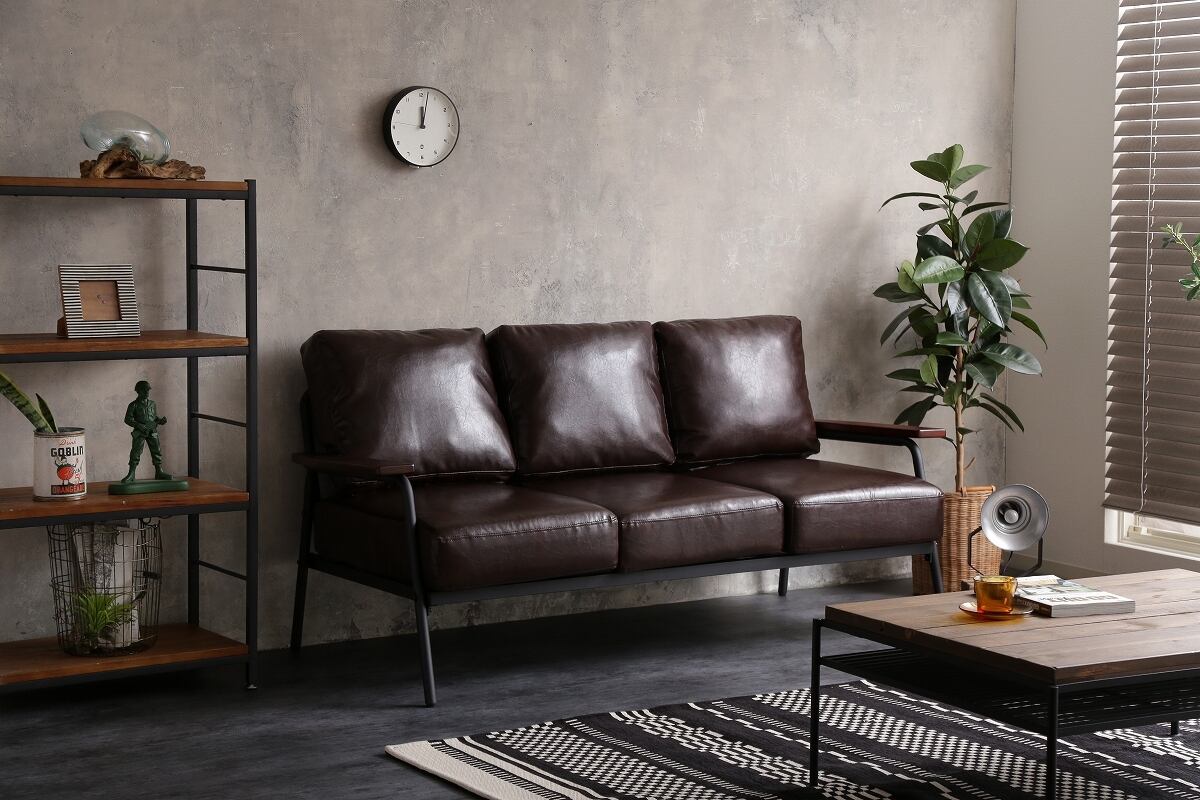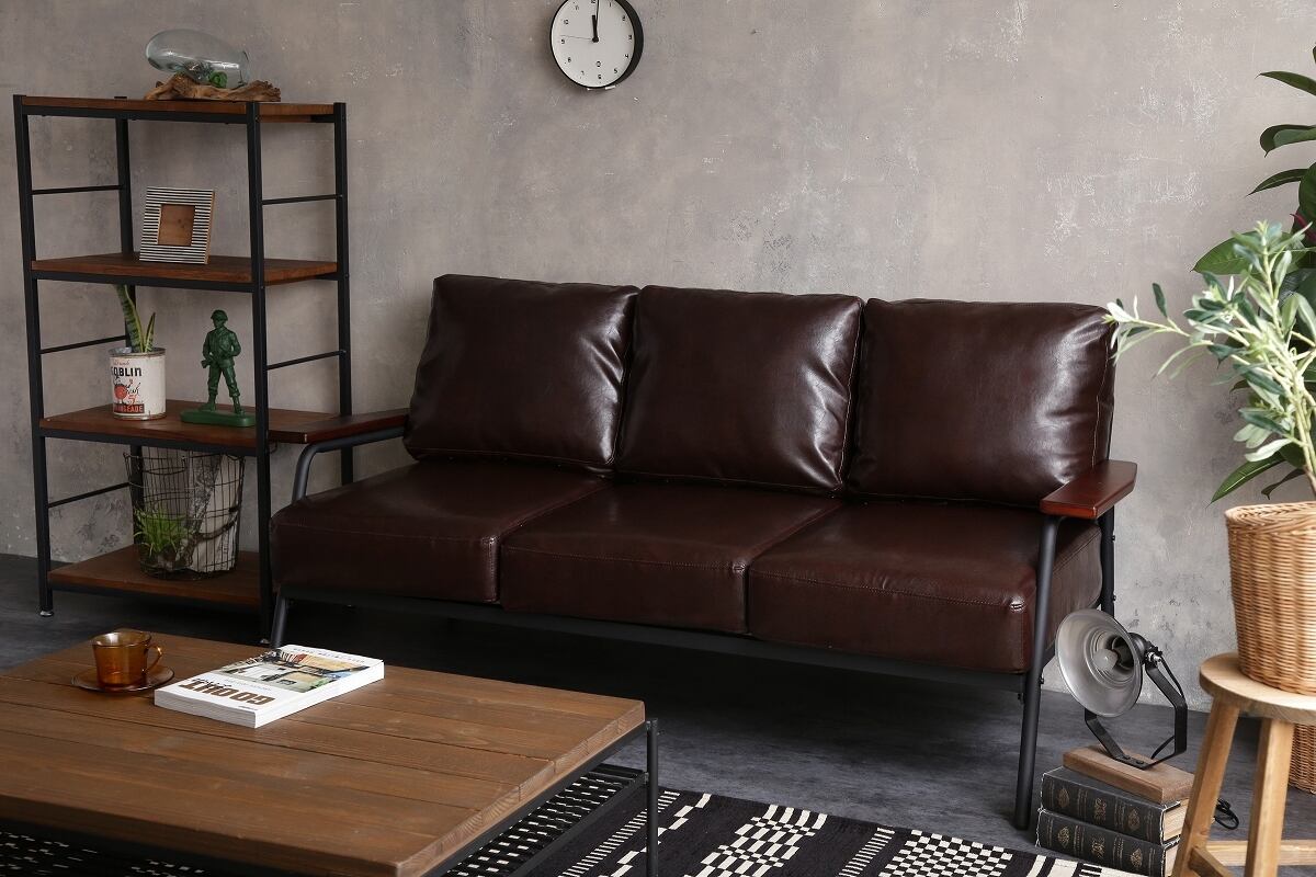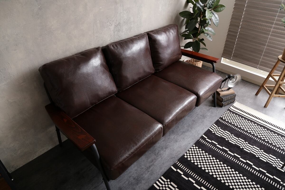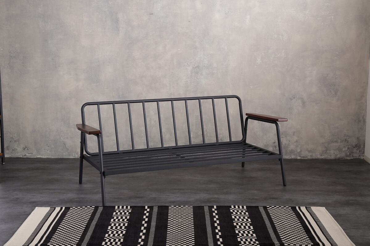 ブラックスチールのフレームと天然木の肘置きを組み合わせたヴィンテージ感あふれる大人な雰囲気の『Basquiat』3人掛けソファ。