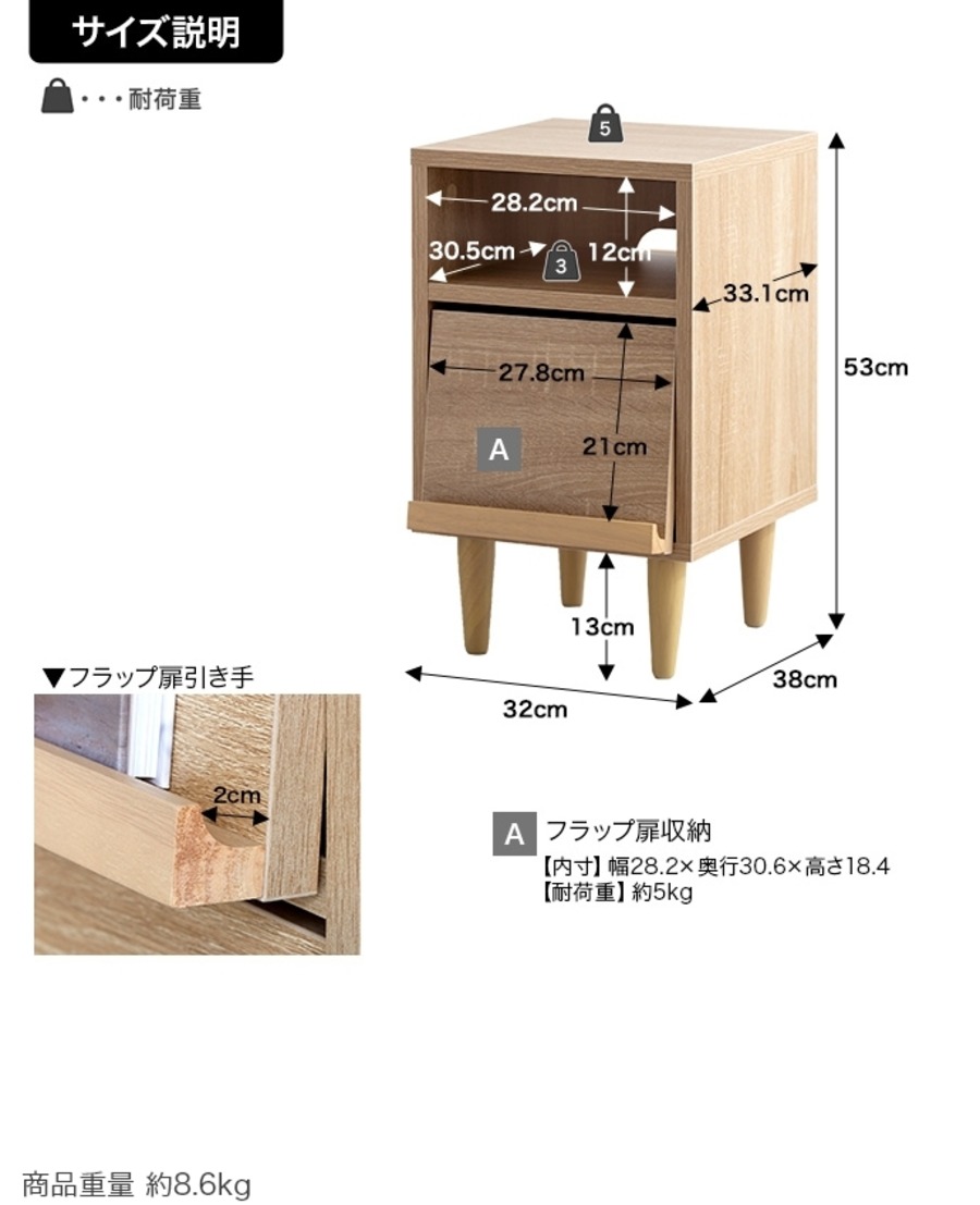 【耐荷重】天板:約5kg 、真ん中固定棚:約3kg、底板:約5kg
