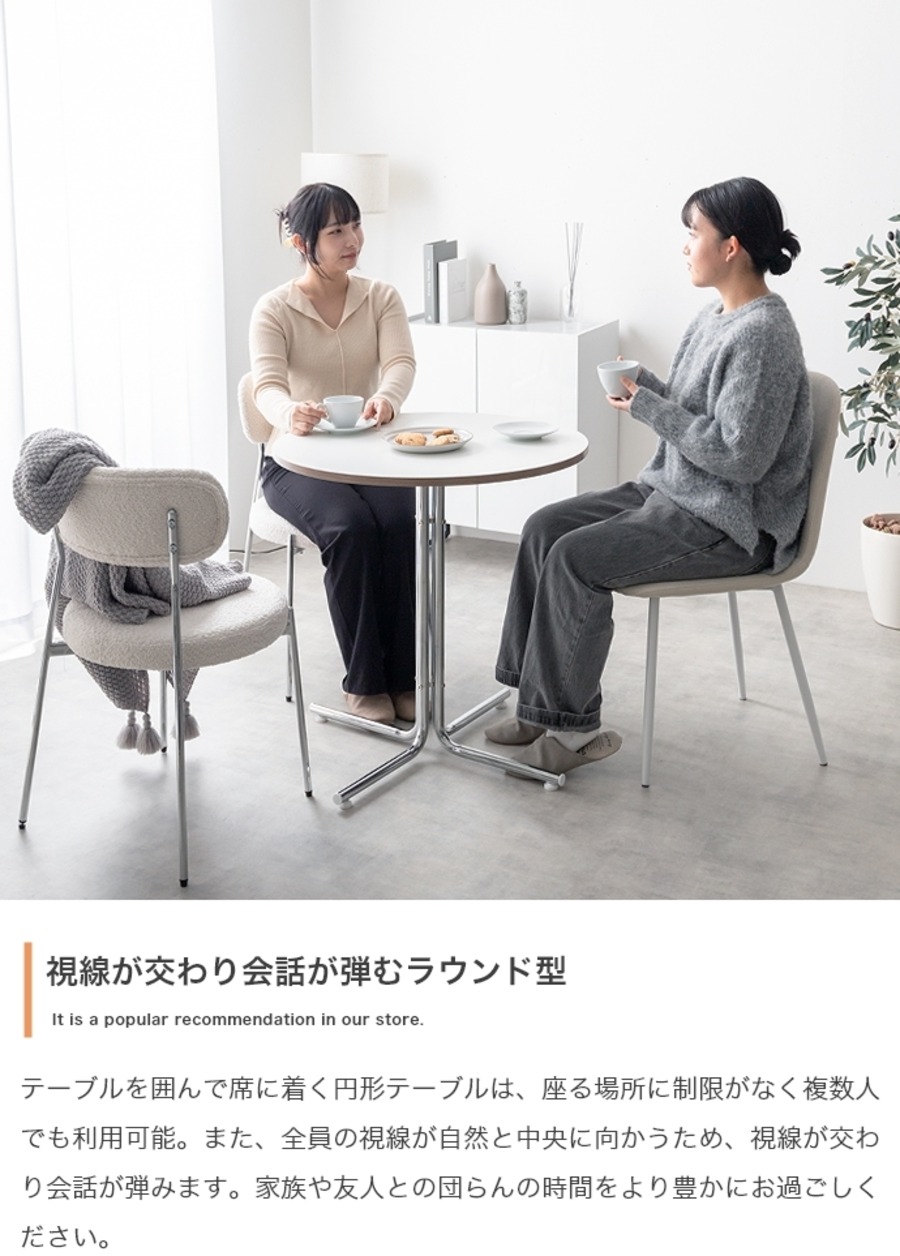 このカフェテーブルは、丸型のフォルムが特徴で、リビングやダイニング、カフェスペースなど多彩なシーンにマッチします。幅70cmというコンパクトなサイズながら、十分な広さを確保し、友人や家族とのくつろぎのひとときを演出します。美しい天然木の天板と、安定感のある脚部との組み合わせが、どんなインテリアとも調和し、優雅で魅力的な空間を創り出します。